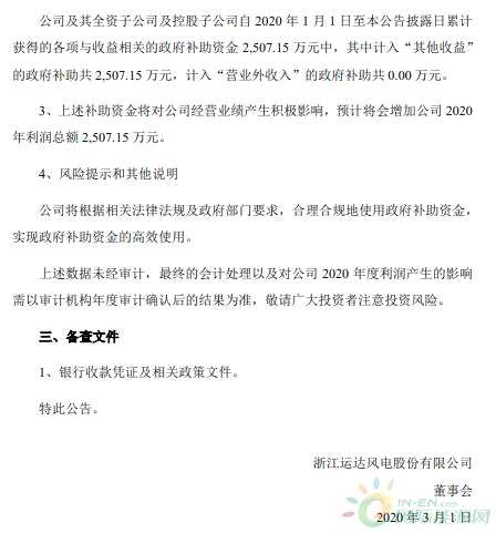 摘要: 3月1日,運(yùn)達(dá)股份發(fā)布《關(guān)于獲得政府補(bǔ)助的公告》。公告稱(chēng),浙江運(yùn)達(dá)風(fēng)電股份有限公司(以下簡(jiǎn)稱(chēng)“公司”)及其全資及控股子公司自2020年1月1日至本公告日累計(jì)獲得與收益相關(guān)的各項(xiàng)政府補(bǔ)助資金共計(jì)人民幣2