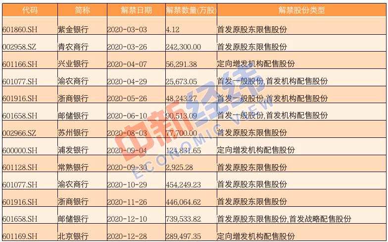 數(shù)據(jù)顯示,2020年,共有16家A股上市銀行限售股解禁。除了西安銀行等已經解禁的銀行外,還包括【青農商行(002958)、股吧】(002958)、興業(yè)銀行(601166)、渝農商行(601077)、浦發(fā)銀行(600000)、常熟銀行(601128)、北京銀行(601169)、蘇州銀行(002966)、浙商銀行(601916)、郵儲銀行(601658),涉及市值超1500億元。