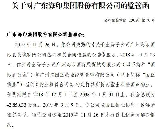去年海印股份4億租賃解約信披遲,董事長邵建明等吃警示函