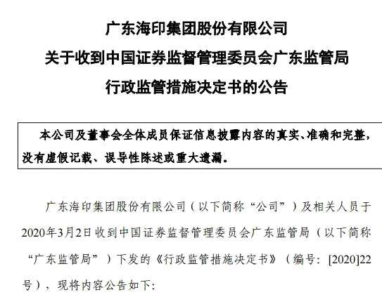 3月3日,【海印股份(000861)、股吧】(000861)發(fā)布公告稱,海印股份及公司董事長邵建明、總裁邵建佳、董事會秘書吳珈樂,被廣東證監(jiān)局采取出具警示函的行政監(jiān)管措施。