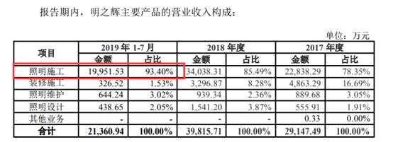 值得注意的是,明之輝的營(yíng)收主要來(lái)源于照明工程業(yè)務(wù),2019年1-7月,照明工程營(yíng)收占總營(yíng)收的93.40%。