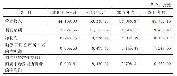 數(shù)據(jù)顯示,瑞瑪工業(yè)2016年至2019年1-9月期間,營業(yè)收入分別為 4.58億元、5.60億元、5.93億元、4.42億元;扣非歸母凈利潤分別為 0.63億元、0.57億元、0.84億元、0.59億元。詳情如下: