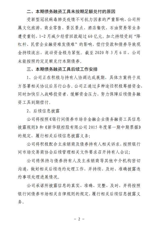 3月6日,新華聯(lián)控股(000036)在上清所發(fā)布公告稱(chēng),新華聯(lián)(000620)控股有限公司(以下簡(jiǎn)稱(chēng)“公司”)2015 年度第一期中期票據(jù)(債券簡(jiǎn)稱(chēng):15 新華聯(lián)控 MTN001,債券代碼:101558006)應(yīng)于 2020 年 3 月 6 日兌付本息。截至到期兌付日終,公司未能按照約定籌措足額兌付資金,“15 新華聯(lián)控 MTN001”不能按期足額兌付本息,已構(gòu)成實(shí)質(zhì)性違約。