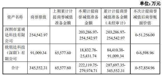 面對(duì)這份不太讓投資者滿意的答卷,奮達(dá)科技給出的解釋是:“對(duì)公司全資子公司深圳市富誠達(dá)科技有限公司(以下簡稱:富誠達(dá))、歐朋達(dá)科技(深圳)有限公司(以下簡稱:歐朋達(dá))形成的商譽(yù)計(jì)提減值、存貨及固定資產(chǎn)計(jì)提減值所致”。