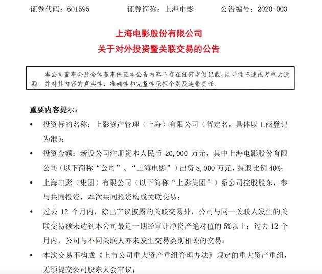 上海電影出資8000萬元設(shè)立合資公司 持股40%