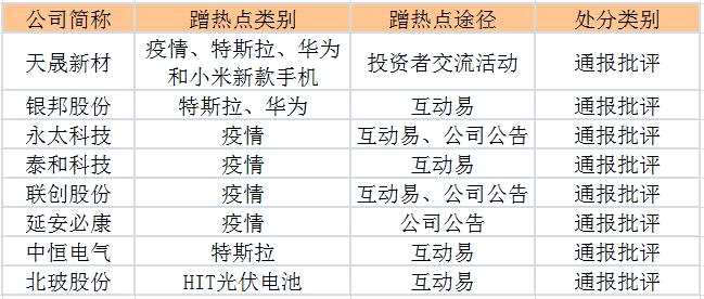 導(dǎo)語前期受到市場(chǎng)關(guān)注、連續(xù)“拉板”的8家公司,因蹭“疫情防控、特斯拉、華為、小米、光伏電池”熱點(diǎn)被給予通報(bào)批評(píng)的紀(jì)律處分。