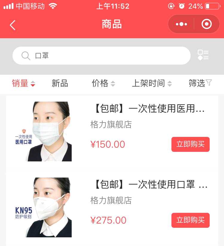 “董明珠的店”顯示,KN95防護(hù)級(jí)別的一次性使用口罩一盒包郵售價(jià)275元,相當(dāng)于每只5.5元;一次性使用醫(yī)用口罩一盒包郵售價(jià)150元,相當(dāng)于每只3元。
