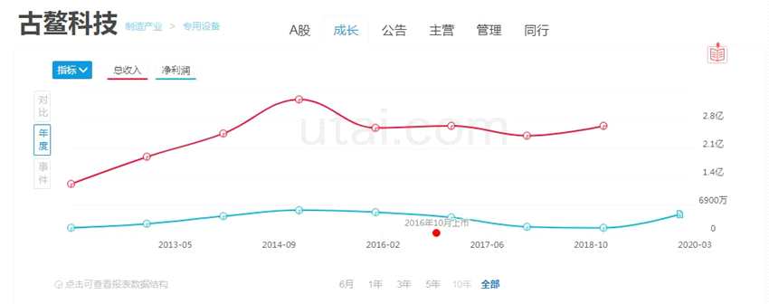 與二級市場的股價行情一樣,古鰲科技上市后的業(yè)績也呈現(xiàn)“高開低走”的態(tài)勢。上市后交出的首份年報成績單并不理想,古鰲科技在2016年實現(xiàn)的營業(yè)收入約為2.63億元,較上年同比微增1.94%,當期對應(yīng)實現(xiàn)的歸母凈利潤約為3801.49萬元,較上年同比下降25.02%。報告期內(nèi)古鰲科技在扣非后凈利潤方面實現(xiàn)的數(shù)額約為3371.04萬元,較上年同比下降15.74%。
