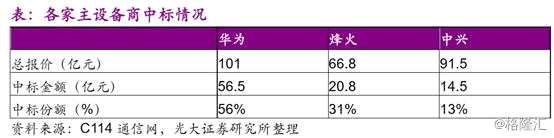 統(tǒng)計以上三家中標人在26個省級公司投標及中標份額,華為總報價為101億元,中標約5.54萬端SPN設備,中標金額56.5億元,中標份額為39.30%;烽火通信報價總計66.8億元,中標約3.44萬端SPN設備,中標金額20.8億元,中標份額為31%;中興通訊報價總計91.5億元,中標約5.13萬端SPN設備,中標金額14.5億元,中標份額為13%。