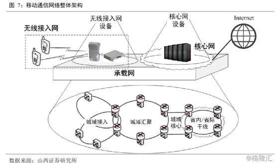 一般而言,移動通信網絡主要包括無線接入網、承載網和核心網三部分。無線接入網主要將終端接入通訊網絡,連接終端及基站兩部分;核心網負責處理終端用戶移動管理、會話管理以及服務管理等,位于基站和因特網之間;承載網則負責數據傳輸,介于無線接入網和核心網之間,為無線接入網和核心網提供網絡連接。