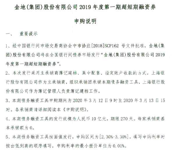 摘要: 3月11日,據(jù)上海清算所披露,金地(集團(tuán))股份有限公司擬發(fā)行一筆超短期融資券,發(fā)行規(guī)模為10億元,申購(gòu)利率區(qū)間為2.3%-3.3%。據(jù)了解,本期債券名稱(chēng)為“金地(集團(tuán))股份有限公司2019年度第一期超