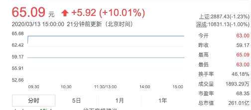 良品鋪子上市并沒收到疫情影響,股價一路走高。今日,早上九點半,良品鋪子開盤價63元/股,漲幅7%,成交量7.705萬手,換手率18.79%,振幅3.27%,量比3423.91。一分鐘不到,每股價格漲到65.09元/股,市值261億,這個價格一直維持到當(dāng)日收盤。