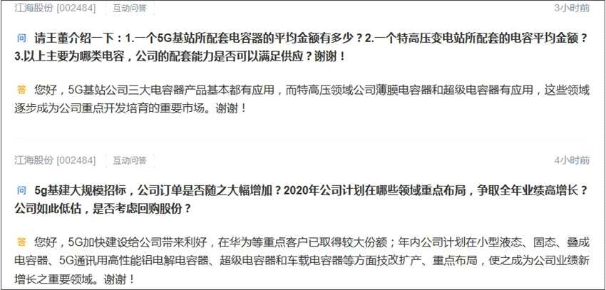 此外,江海股份指出,5G加快建設(shè)給其帶來(lái)利好,該公司三大電容器產(chǎn)品(鋁電解電容器、薄膜電容器、超級(jí)電容器)基本在5G基站都有應(yīng)用。年內(nèi)計(jì)劃在小型液態(tài)、固態(tài)、疊成電容器、5G通訊用高性能鋁電解電容器、超級(jí)電容器和車載電容器等方面技改擴(kuò)產(chǎn)、重點(diǎn)布局,使之成為該公司業(yè)績(jī)新增長(zhǎng)之重要領(lǐng)域。