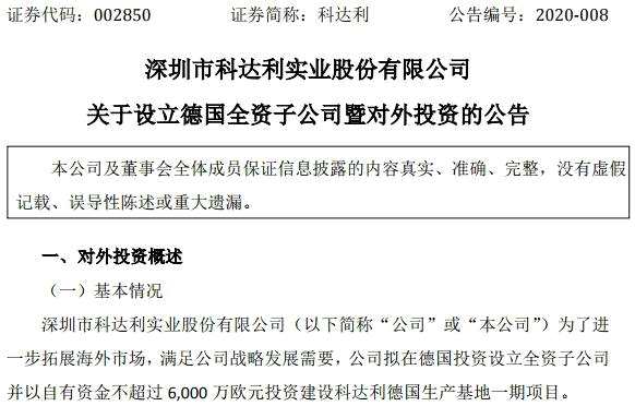 【科達(dá)利(002850)、股吧】(002850)擬在德國投資設(shè)立全資子公司,該公司注冊資本100萬歐元。同時,公司擬以自有資金不超過6000萬歐元,投資建設(shè)科達(dá)利德國生產(chǎn)基地一期項(xiàng)目,該項(xiàng)目達(dá)產(chǎn)后預(yù)計(jì)將實(shí)現(xiàn)年產(chǎn)值約1億歐元。