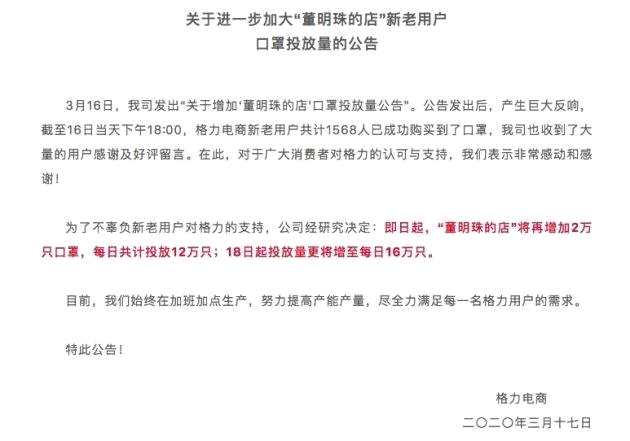 今天上午,格力電商今天發(fā)布公告稱,即日起,“董明珠的店”將再增加2萬只口罩,每日共計投放12萬只;18日起投放量更將增至每日16萬只。