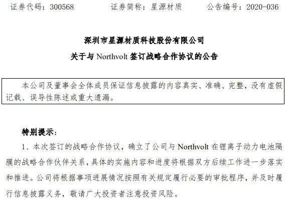 3月18日午間,星源材質(zhì)(300568)發(fā)布公告,公司與Northvolt AB(以下簡稱“Northvolt”)擬建立動力鋰電池隔膜戰(zhàn)略合作伙伴關系,并已簽署戰(zhàn)略合作協(xié)議。公司將配合Northvolt的產(chǎn)能釋放計劃,可分別從常州工廠及將來可能新建的歐洲工廠向Northvolt供應鋰離子電池隔膜用品,預計總投資金額不超過20億元。