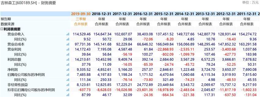 財務(wù)數(shù)據(jù)顯示,2014年以來,吉林森工扣非后歸母凈利連續(xù)多年未負(fù)。公司尚未公布2019年度財務(wù)數(shù)據(jù),截至2019年三季度,公司扣非后歸母凈利為-637.73萬元,同比增87.99%。此外,實現(xiàn)營收11.45億元,同比增9.52%,實現(xiàn)歸母凈利7485.88萬元,同比增111.34%。