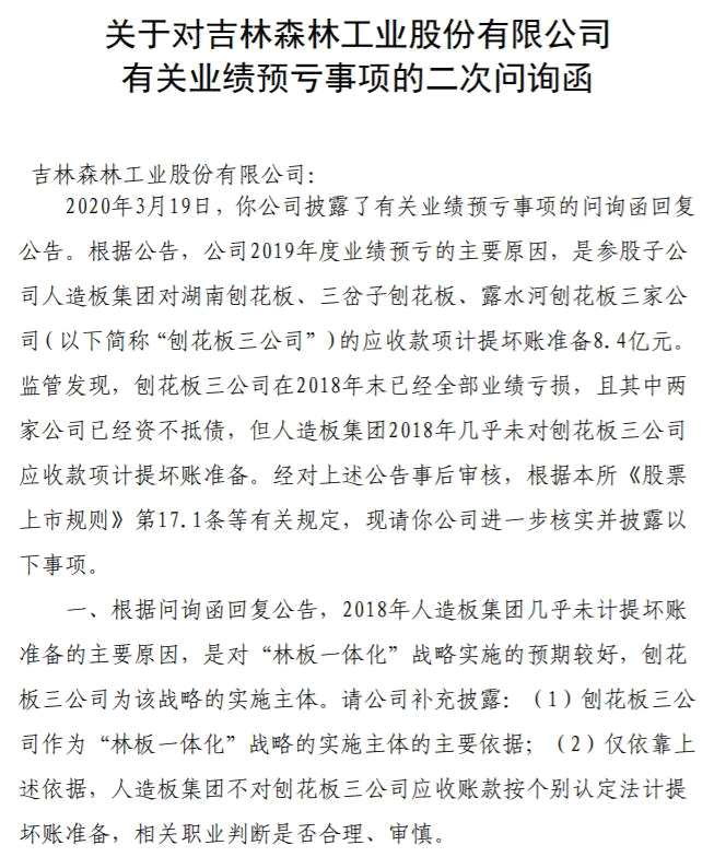 3月19日電 19日,上交所向吉林森林工業(yè)股份有限公司(證券簡稱:【吉林森工(600189)、股吧】(600189))下發(fā)有關(guān)業(yè)績預(yù)虧事項的二次問詢函。問詢函指出,公司參股子公司人造板集團(tuán)2019年對三家刨花板公司的應(yīng)收款項計提8.4億元壞賬準(zhǔn)備,卻在前一年幾乎未計提,要求說明相關(guān)職業(yè)判斷是否合理、審慎。