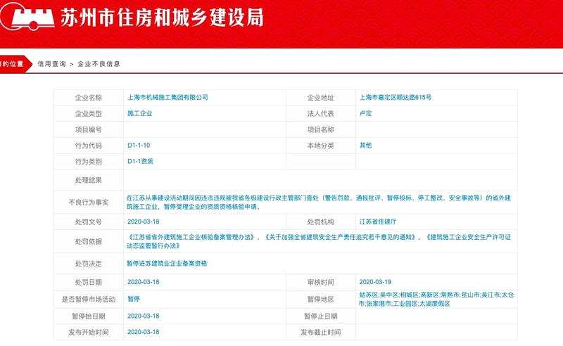 財經(jīng)3月20日據(jù)蘇州市住房和城鄉(xiāng)建設局官網(wǎng)發(fā)布的企業(yè)不良信息顯示,上海市機械施工集團有限公司在江蘇從事建設活動期間因違法違規(guī)被江蘇省各級建設行政主管部門查處(警告罰款、通報批評、暫停投標、停工整改、安全事故等)的省外建筑施工企業(yè),暫停受理企業(yè)的資質(zhì)資格核驗申請。處罰日期為2020年03月18日,發(fā)布開始時間為2020年03月18日。