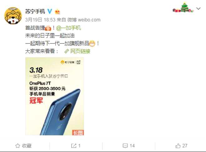 而一加進駐蘇寧的首日,也交出了一張漂亮的成績單,據(jù)蘇寧手機發(fā)布的戰(zhàn)報顯示,OnePlus 7T斬獲2500-3000元手機單品銷量冠軍。