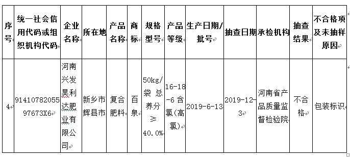 附件復(fù)混肥料等4種產(chǎn)品質(zhì)量監(jiān)督抽查企業(yè)情況表顯示,河南興發(fā)昊利達(dá)肥業(yè)有限公司被抽查顯示不合格的復(fù)合肥料商標(biāo)為百泉,型號規(guī)格為50kg/袋 總養(yǎng)分≥40.0%,產(chǎn)品等級16-18-6含氯(高氯),生產(chǎn)日期為2019年6月13日,不合格原因為包裝標(biāo)識。承檢機構(gòu)為河南省產(chǎn)品質(zhì)量監(jiān)督檢驗院。