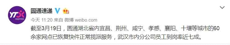 圓通湖北省內(nèi)60余家網(wǎng)點已正常運營 員工到崗率近七成