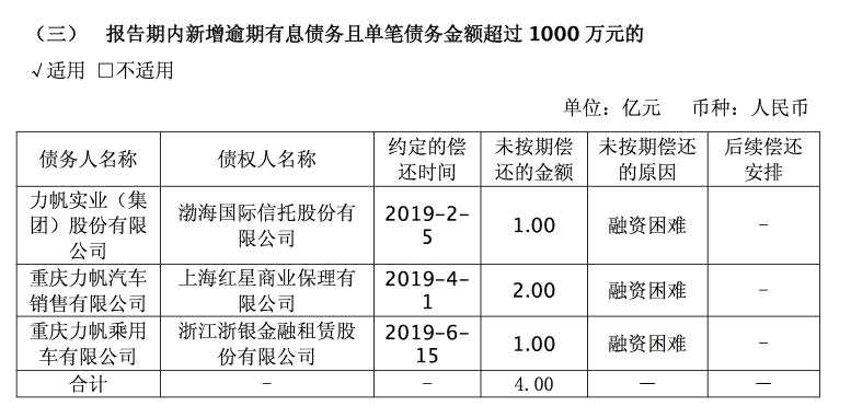 根據(jù)公告顯示,截止2019年6月,力帆控股負(fù)債率達(dá)75%以上,且力帆控股已出現(xiàn)多筆債務(wù)逾期。對于逾期原因,公告均稱“融資困難”。