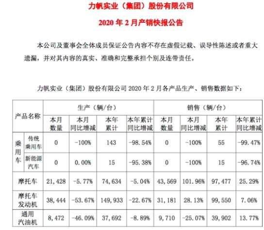 3月13日,力帆股份發(fā)布2020年2月產(chǎn)銷快報公告顯示,整個2月力帆股份乘用車產(chǎn)量和銷量均為0,同比下滑100%。力帆曾在2月對外表示,2月22日復(fù)工后共接到5億元訂單,不過全是摩托車。