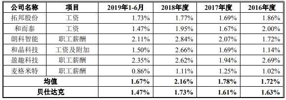 2016年-2019年1-6月,貝仕達克管理人員薪酬分別為532.72萬元、760.42萬元、965.64萬元和565.23萬元。管理人員薪酬福利費 占營業(yè)收入的比例分別為1.63%、1.61%、1.73%、1.47%。同行業(yè)上市公司管理人員薪酬福利費占營業(yè)收入的比例均值分別為1.72%、1.78%、2.16%、1.67%。