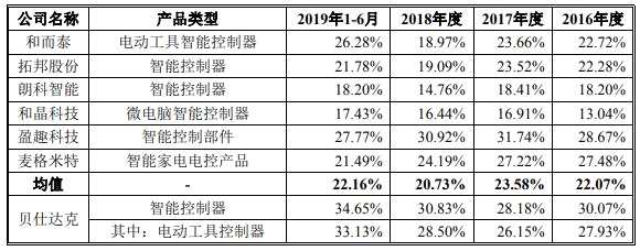 三年一期,貝仕達克智能控制器毛利率遠超同行均值,2018年和2019年上半年,貝仕達克智能控制器毛利率均超過同行均值逾10個百分點。2016年-2019年1-6月,貝仕克達的智能控制器毛利率分別為30.07%、28.18%、30.83%和34.65%。同行業(yè)上市公司智能控制器毛利率均值分別為22.07%、23.58%、20.73%、22.16%。2019年全年貝仕克達的智能控制器毛利率繼續(xù)走高達35.76%。