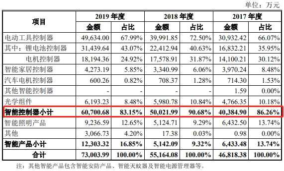 貝仕達克主營業(yè)務為智能控制器及智能產(chǎn)品的研發(fā)、生產(chǎn)和銷售。2017年-2019年,智能控制器產(chǎn)品收入占貝仕達克主營業(yè)務收入的比例分別達86.26%、90.68%、83.15%。
