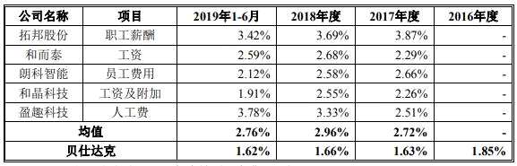 有可比數(shù)據(jù)的兩年一期,貝仕達克研發(fā)人員薪酬福利費占營收的比例始終為同行墊底。2016年-2019年1-6月,貝仕達克研發(fā)人員薪酬福利費分別為605.71萬元、770.24萬元、927.25萬元和622.09萬元,占營業(yè)收入的比例分別為1.85%、1.63%、1.66%、1.62%。2017年-2019年1-6月,同行業(yè)上市公司研發(fā)人員薪酬福利費占營業(yè)收入的比例均值分別為2.72%、2.96%、2.76%。