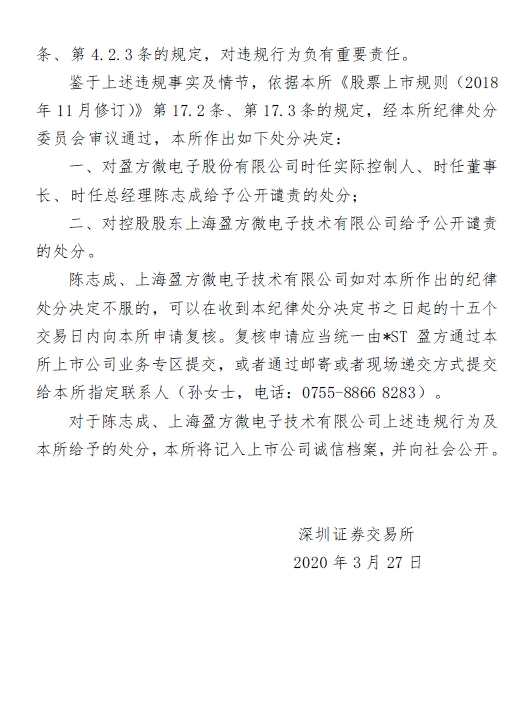 鑒于上述違規(guī)事實(shí)及情節(jié),依據(jù)深交所《股票上市規(guī)則(2018年11月修訂)》第17.2條、第17.3條的規(guī)定,經(jīng)深交所紀(jì)律處分委員會(huì)審議通過(guò),深交所對(duì)*ST盈方時(shí)任實(shí)際控制人、時(shí)任董事長(zhǎng)、時(shí)任總經(jīng)理陳志成給予公開(kāi)譴責(zé)的處分;對(duì)控股股東上海盈方微電子技術(shù)有限公司給予公開(kāi)譴責(zé)的處分。