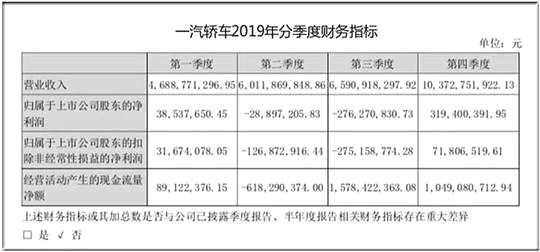 而倘若再對(duì)一汽轎車2019年的四個(gè)季度盈利狀態(tài)進(jìn)行深究。便會(huì)發(fā)現(xiàn),要是拿掉盈利暴漲的第四季度,一汽轎車前三季度歸屬于上市公司股東的凈利潤(rùn)還是虧損狀態(tài),且虧損額高達(dá)2.67億元。換言之,一汽轎車在第四季度上演的業(yè)績(jī)“大爆發(fā)”,才是其最終扭虧為盈的關(guān)鍵。