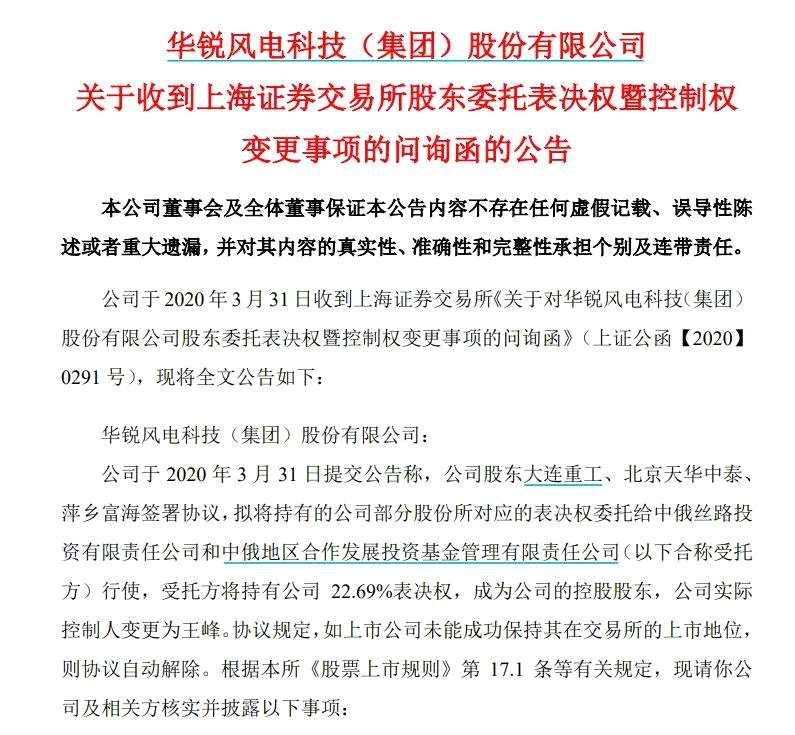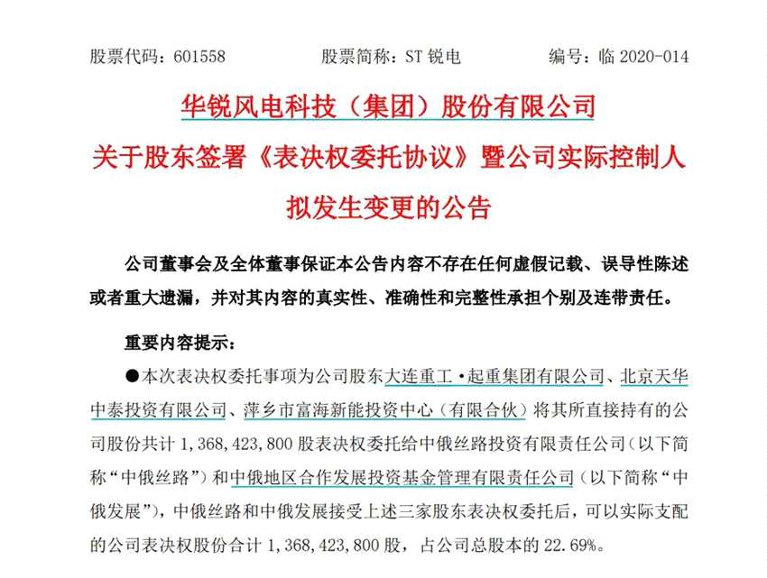 ST銳電昨晚發(fā)布公告稱,公司于2020年3月31日提交公告稱,公司股東【大連重工(002204)、股吧】(002204)、北京天華中泰、萍鄉(xiāng)富海簽署協(xié)議,擬將持有的公司部分股份所對應的表決權委托給中俄絲路投資有限責任公司和中俄地區(qū)合作發(fā)展投資基金管理有限責任公司行使,受托方將持有公司22.69%表決權,成為公司的控股股東,公司實際控制人變更為王峰。
