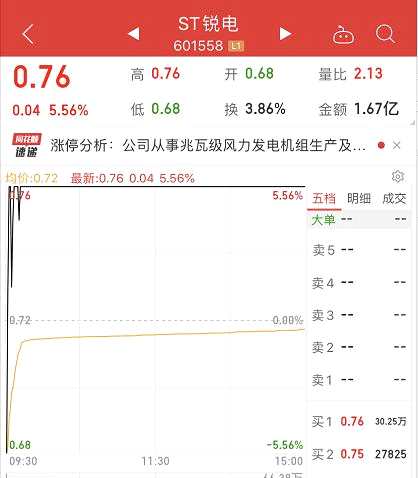 在這攸關退市的最后關口,今早跌停開盤的ST銳電,股價瞬間彈起,最終封住漲停,報收0.76元。暫時躲過這一劫。