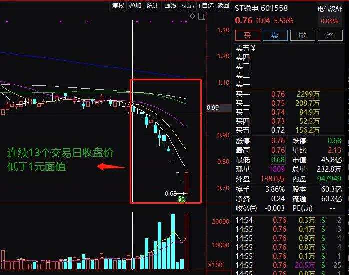 今天收報0.76元,則未來7個交易日,ST銳電還是有機會重回1元上方,存在避免連續(xù)20個交易日收盤價低于1元面值退市的可能性。