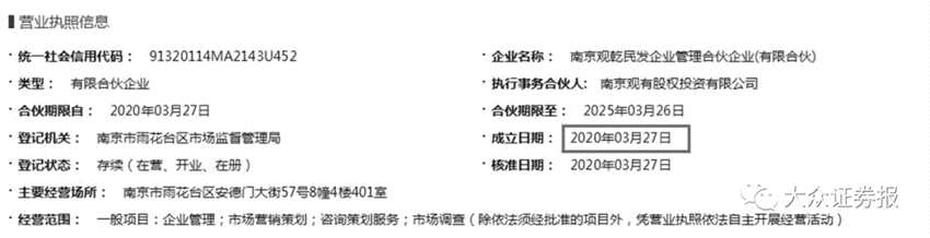 有意思的是,受讓方觀乾民發(fā)在上述協(xié)議簽署兩日前剛剛成立。國家企業(yè)信用信息公示系統(tǒng)數(shù)據(jù)顯示,觀乾民發(fā)成立日期為2020年3月27日(圖1),經(jīng)營范圍為企業(yè)管理、市場營銷策劃、咨詢策劃服務(wù)、市場調(diào)查,注冊資本為23100萬元,注冊地址為南京市雨花臺區(qū)安德門大街57號8棟401室。