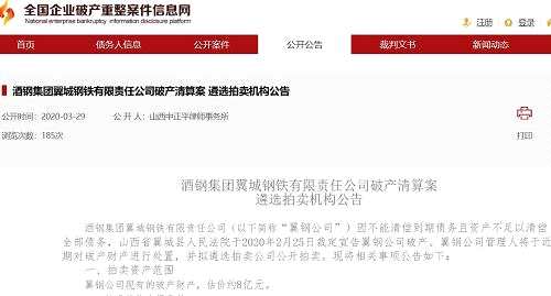 摘要: 【訊】3月29日,據(jù)全國企業(yè)破產(chǎn)重整案件信息網(wǎng)公告,酒鋼集團翼城鋼鐵有限責任公司(下稱翼鋼公司)將對破產(chǎn)財產(chǎn)進行處置,并擬遴選拍賣公司公開拍賣。公告顯示,翼鋼公司于2月25日被裁定破產(chǎn),公司現(xiàn)有破產(chǎn)財