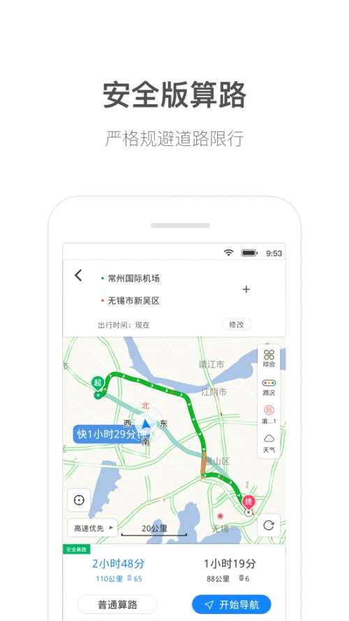 值得注意的是, “貨車(chē)通”在注冊(cè)應(yīng)用時(shí),將記錄車(chē)主所用的車(chē)輛信息,通過(guò)自車(chē)參數(shù)、出發(fā)時(shí)間,規(guī)避不可通行的道路,為用戶提供準(zhǔn)確的費(fèi)用預(yù)估信息;其中豐富的物理及政策限行信息以多種方式呈現(xiàn)在地圖上,為車(chē)主提供更便利的信息查詢,有效的為車(chē)主提供更為安全的路線選擇。安全版算路在普通算路模式基礎(chǔ)上對(duì)“超限超載”進(jìn)行了更為嚴(yán)格定義規(guī)范,可以為貨車(chē)車(chē)主更好地避讓限行。