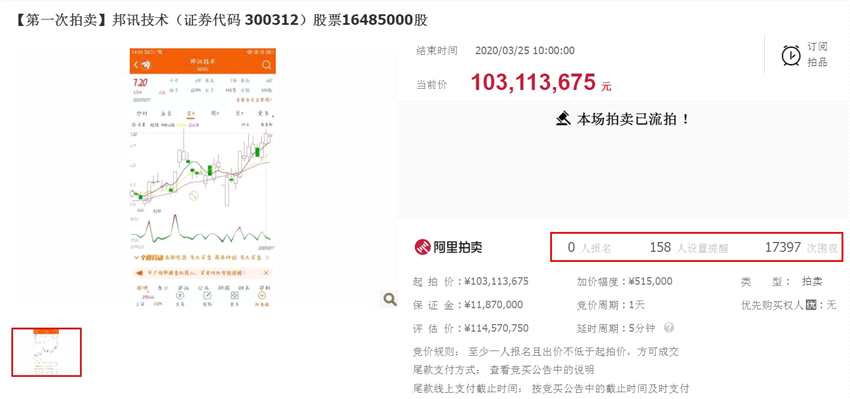 淘寶網(wǎng)司法拍賣網(wǎng)絡(luò)平臺(tái)顯示,2020年3月24日10時(shí)至2020年3月25日10時(shí),張慶文持有的1648.5萬(wàn)股邦訊技術(shù)股份第一次拍賣,起拍價(jià)為1.03億元。最終因無人報(bào)名而流拍。