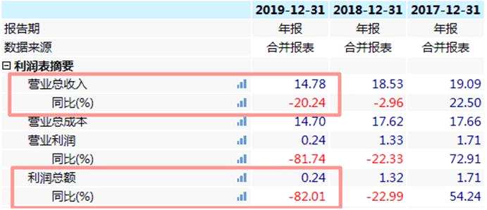 主要從事針織設(shè)備電腦控制系統(tǒng)及IC產(chǎn)品分銷的上市公司【睿能科技(603933)、股吧】(603933)于3月20日發(fā)布了2019年年報(bào),全年?duì)I業(yè)總收入由上一年的18.53億元下滑到14.78億元,同比下降了20.24%,而相較總營(yíng)收的下降幅度,2019年利潤(rùn)總額的同比下降幅度則更為驚人,高達(dá)82.01%,利潤(rùn)總額僅有0.24億元,而在上一年,這一規(guī)模還有1.32億元。