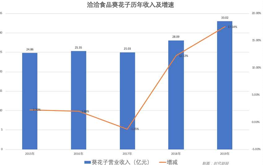 在過(guò)去很長(zhǎng)一段時(shí)間里,它的瓜子陷入了銷售瓶頸。2015年-2017年,其葵花子的營(yíng)收分別為24.86億元、25.35億元、25.03億元,增速分別為2.30%、1.99%、-1.25%,直到2018年,增速才達(dá)到12.22%。