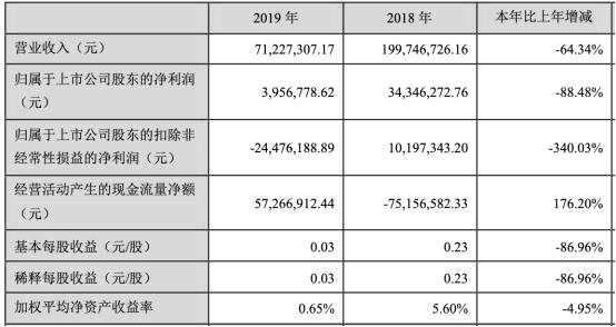 上市第三年,宇環(huán)數(shù)控業(yè)績再度大幅下滑,扣非歸母凈利潤為負。今年4月2日宇環(huán)數(shù)控披露的2019年年報顯示,公司實現(xiàn)營業(yè)收入7122.73萬元,較上年同期減少64.34%;實現(xiàn)歸屬于上市公司股東的凈利潤395.68萬元,較上年同期減少88.48%;實現(xiàn)歸屬于上市公司股東的扣除非經(jīng)常性損益的凈利潤-2447.62萬元,較上年同期減少340.03%;經(jīng)營活動產(chǎn)生的現(xiàn)金流量凈額為5726.69萬元,較上年同期增長176.20%。
