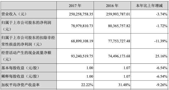 上市當年,宇環(huán)數(shù)控營收凈利雙下滑。2017年年報顯示,宇環(huán)數(shù)控實現(xiàn)營業(yè)收入2.50億元,比上年同期減少3.74%;實現(xiàn)歸屬于上市公司股東的凈利潤7897.98萬元,比上年同期減少1.72%;實現(xiàn)歸屬于上市公司股東的扣除非經(jīng)常性損益的凈利潤6889.91萬元,比上年同期增減少11.39%;經(jīng)營活動產(chǎn)生的現(xiàn)金流量凈額為9324.05萬元,比上年同期增長25.16%;消費電子制造業(yè)毛利率為43.72%,比上年同期減少7.78個百分點。