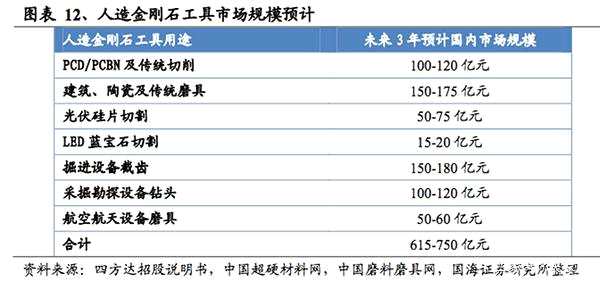 應用領域廣泛,市場規(guī)模必定少不了。早在2009年,全球金剛石工具市場已突破200億美元。國內(nèi)市場同樣不小。國海證券2016年研報預測,預計未來三年內(nèi)國內(nèi)市場市場規(guī)模大概在615億元―750億元左右。