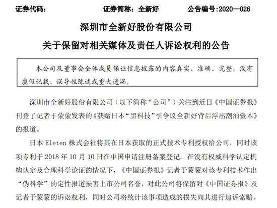 全新好:將保留對《中國證券報》及記者的訴訟權利