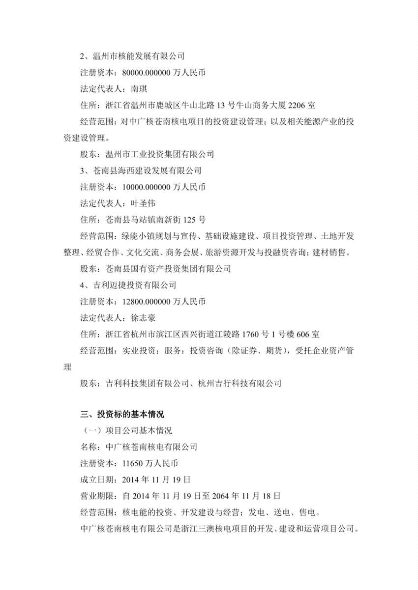 本次增資擴(kuò)股完成后股權(quán)結(jié)構(gòu)為: 中國(guó)廣核(003816)集團(tuán)有限公司出資 4.6 億元,占比 46%;浙能電力出資 3.4 億元,占比 34%;溫州市核能發(fā)展有限公司出資 0.9億元,占比 9%;蒼南縣海西建設(shè)發(fā)展有限公司出資 0.9 億元,占比 9%;吉利邁捷投資有限公司出資 0.2 億元,占比 2%。