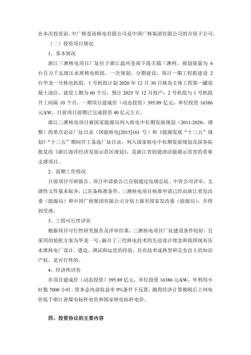 摘要: 日前,浙能電力(600023)發(fā)布了關(guān)于參股投資中廣核蒼南核電有限公司的公告。浙能電力以非公開(kāi)協(xié)議增資方式入股中廣核蒼南核電有限公司(以下簡(jiǎn)稱(chēng)“項(xiàng)目公司”),與合作方共同投資開(kāi)發(fā)建設(shè)運(yùn)營(yíng)浙江三澳.