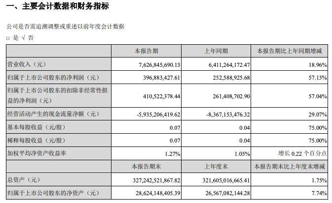 報告顯示,期內(nèi)公司營業(yè)收入76.27億元,同比增長18.96%;歸屬于上市公司股東的凈利潤3.97億元,同比增長57.13%;歸屬于上市公司股東的扣非凈利潤4.11億元,同比增長57%;經(jīng)營活動產(chǎn)生的現(xiàn)金流量凈額為-59.35億元,去年同期則為-83.67億元;加權(quán)平均凈資產(chǎn)收益率僅1.27%,同比上升0.22個百分點。